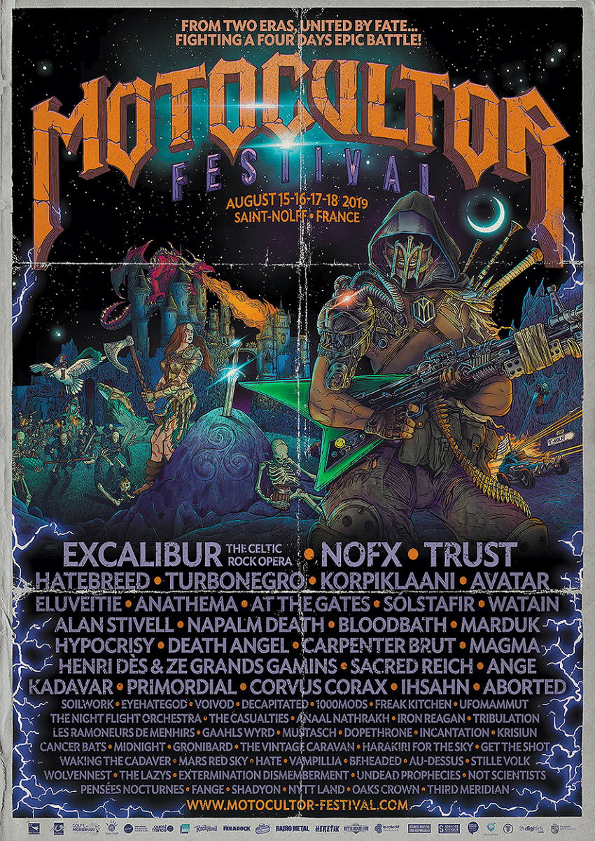 C’est donc avec un réel plaisir que nous couvrirons en images la déclinaison 2019 de cet événement haut en couleurs, et dont la programmation s’avère fort attrayante. Outre les « ténors » que sont Excalibur (Opera Rock réunissant plus de 120 artistes sur scène), NOFX , voire même Trust (guère convaincant ces dernières années) nous aimerions également couvrir Death Angel, Ange, Soilwork, Kadavar, Hypocrisy, Magma, Watain, mais aussi Cancer Bats, Gronibard, Krisiun, Anaal Nathrakh, Decapitated, Eyehategod, Marduk, At The Gates, Hate, Pensées Nocturnes, Voivod, Ufomammut, Avatar, Sacred Reich, ou encore Napalm Death et Bloodbath. Un programme dantesque, mais qu’il est bon de voir les choses en grand !