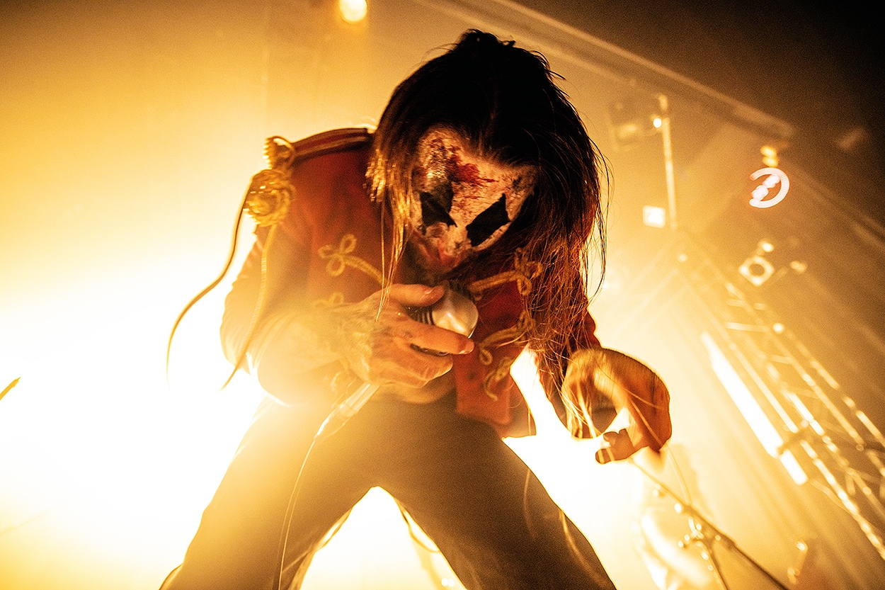 Mantra, troisième « invité » de la soirée, mais non des moindres puisqu’il explore la scène metal progressive depuis une dizaine d’années, est un véritable OVNI, dont le jeu de scène, très développé et chorégraphié, constitue un vrai plaisir pour les yeux. Une très belle découverte pour moi qui ne l’avait encore jamais vu en concert. C’est ensuite au tour de Déluge, avec un registre qui s’étend du black metal au metalcore, de monter sur scène. Côté musical, rien à redire, l’ensemble est efficace et dégage une belle énergie, mais j’avoue que je décroche vite du fait des éclairages tous en contre-jour et qui ne laissent voir que des musiciens en ombres chinoises. Je prends seulement quelques images avant de m’accorder une pause au bar : inutile de multiplier les clichés qui, au final se ressembleront tous et ne laisseront voir que des silhouettes. La soirée se termine royalement par le set de Pensées Nocturnes, formation parisienne que son leader Vaerohn (chant, harmonica, mégaphone, trombone à coulisse, trompette et autres) qualifie de « déglingué black metal ». S’entremêlent ainsi des instruments de toutes catégories, créant un univers unique aux ambiances multiples (du cirque à l’horreur) renforcé par le fait que tous les musiciens sont grimés en clowns cauchemardesques, histoire de bien dormir la nuit avant de couvrir la dernière date du festival.