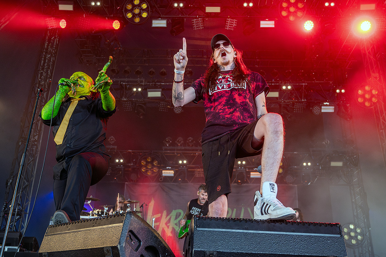 Quelques minutes plus tard, je file devant le show des américains de Nekrogoblikon, groupe qui mélange death metal et compositions très folk. Comme à son habitude, l’un des deux chanteurs officie dans un déguisement de gobelin qui apporte une certaine touche d’humour à l’ensemble : un moment aussi amusant que sympathique. C’est donc le sourire aux lèvres que je poursuis ma journée devant le set de Crypta. Et quel concert ! Le quatuor brésilien féminin de death metal assure sur scène, porté notamment par sa dynamique chanteuse et bassiste Fernanda Lira, aux mimiques inimitables. J’effectue un bref retour ensuite sous les tentes, pour suivre Train Fantôme, qui joue clairement dans un registre auquel je suis insensible, même si les musiciens semblent fort sympathiques, avant d’en ressortir pour suivre Toxic Holocaust, dont le thrash metal me parle nettement plus !