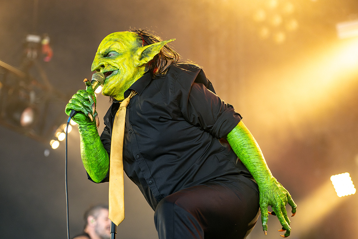 Je fais ensuite l’impasse sur Bernard Minet, au profit de Jinjer. Force est cependant d’admettre que la prestation des ukrainiens repose essentiellement sur la présence scénique de Tatiana Shmayluk, son emblématique chanteuse, le reste de la bande étant nettement en retrait. De ce fait, je garde de ce concert un souvenir assez mitigé, ayant clairement préféré la prestation du groupe quelques jours auparavant au Festival 666. Une courte pause, avant d’entrer dans le pit photo de la Supositor Stage et couvrir le groupe norvégien de black metal avant-gardiste Dodheimsgard qui s’illustre par son set délirant. C’est dans une atmosphère obscure et enfumée que le chanteur Vicotnik, en transe, secouant doucement des bâtons d’encens tout en jetant au hasard une poudre verdâtre se met à chanter, non sans s’être octroyé une pause entre deux titres pour grimper sur les structures de la scène.