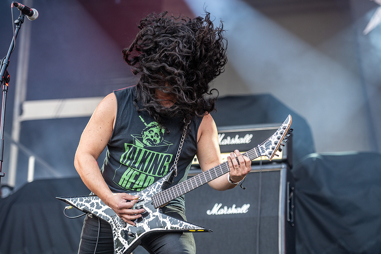J’enchaîne aussitôt avec le concert d’Exodus, célèbre entité américaine de thrash metal qui écume les scènes depuis 1981. C’est toujours un plaisir de voir ces vétérans, d’autant que son chanteur Steve Souza, toujours très en verve, galvanise la foule, épaulé dans cette tâche par le guitariste Gary Holt, qui saute dans tous les sens, en haranguant le public qui répond parfaitement à ses appels : un autre excellent concert ! Mais à peine ai-je quitté le pit photo que je dois me ruer devant Les Sheriff qui passent sur la Bruce Dickinscène durant le même créneau horaire : un concert de punk-rock endiablé fort sympathique, avec une foule très en liesse qui multiplie les slams. Sans transition, je continue mon parcours par Emmure, qui nous offre un deathcore de bon aloi, les américains étant très en forme et visiblement heureux d’être là. Je m’offre ensuite un petit voyage en Extrême-Orient avec Broken By The Scream, groupe japonais exclusivement féminin qui mêle chants clairs et screams : original, frais, scénique et très dépaysant. Une petite bouffée d’air frais, d’autant que les musiciennes sont très à l’aise sur scène.