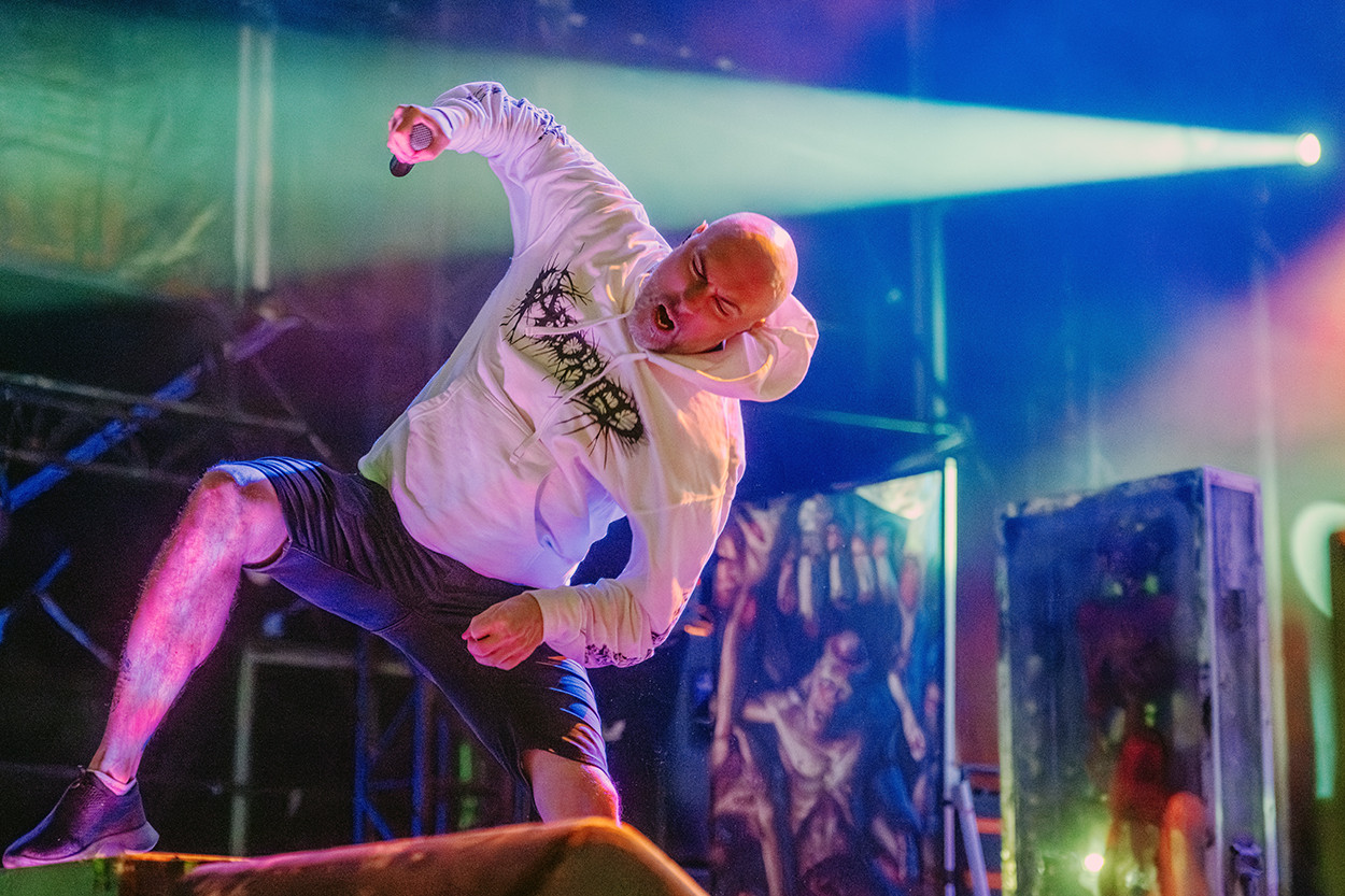 Je fais ensuite l’impasse sur Bernard Minet, au profit de Jinjer. Force est cependant d’admettre que la prestation des ukrainiens repose essentiellement sur la présence scénique de Tatiana Shmayluk, son emblématique chanteuse, le reste de la bande étant nettement en retrait. De ce fait, je garde de ce concert un souvenir assez mitigé, ayant clairement préféré la prestation du groupe quelques jours auparavant au Festival 666. Une courte pause, avant d’entrer dans le pit photo de la Supositor Stage et couvrir le groupe norvégien de black metal avant-gardiste Dodheimsgard qui s’illustre par son set délirant. C’est dans une atmosphère obscure et enfumée que le chanteur Vicotnik, en transe, secouant doucement des bâtons d’encens tout en jetant au hasard une poudre verdâtre se met à chanter, non sans s’être octroyé une pause entre deux titres pour grimper sur les structures de la scène.