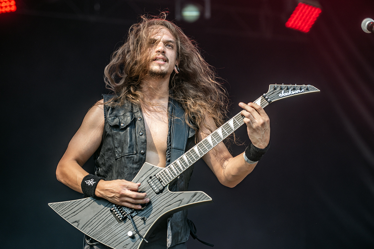 Après avoir consacré mes premières heures à visiter les différents stands installés sur le site de Kerampuilh, j’entrai dans le pit photo peu avant 16 heures, afin d’y suivre Loudblast. Je ne fus donc guère surpris d’apprécier une fois de plus le show de Stéphane Buriez et de sa bande, tant il est vrai que je les ai déjà couverts un nombre incalculable de fois. J’ai également été touché par l’hommage à Ozzy Osbourne rendu par le groupe : chaque musicien portait un t-shirt à l’effigie de ce grand monsieur disparu le 22 juillet 2025. J’enchaînai ensuite avec Skeletal Remains : les américains, gonflés à bloc, galvanisèrent le public qui ne se fit pas prier pour bouger dans tous les sens, contrastant ainsi avec les compositions très carrées et jouées sans la moindre anicroche. Un régal !
