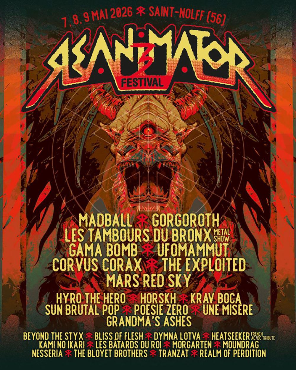 La troisième édition du Re-Animator Festival se déroulera à Saint-Nolff, dans le Morbihan, du 7 au 8 mai 2026. Son affiche comporte vingt-sept groupes.
