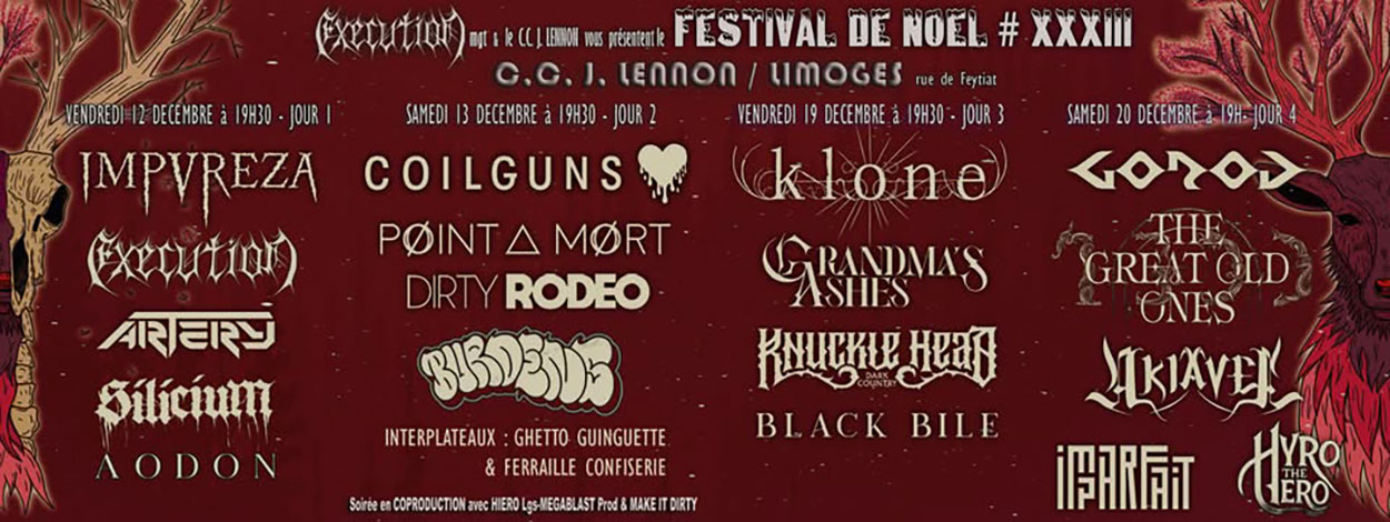 La trente-troisième édition du Festival de Noël, organisé par Execution Management, se déroulera à Limoges, au sein de l’emblématique centre culturel John Lennon, durant les deux week-ends encadrant la mi-décembre. Selon les dates, quatre ou cinq groupes par soirée se produiront sur scène.